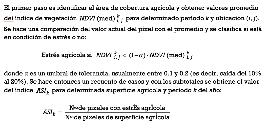 El Índice de estrés agrícola (ASI, por sus siglas en inglés: Agricultural Stress Index) es un indicador que permite evaluar el grado de afectación por sequía en zonas agrícolas mediante la detección de anomalías en la vegetación. Su cálculo se basa en el NDVI (Índice de vegetación de diferencia normalizada) antes descrito, que se obtiene a partir de imágenes satelitales y refleja el estado fisiológico de la cobertura vegetal. El ASI estima el porcentaje de superficie agrícola dentro de una región determinada que presenta valores de NDVI significativamente inferiores a su comportamiento histórico para un mismo periodo del año. Este índice, entonces, resume espacialmente el impacto del estrés hídrico en cultivos, lo que facilita la detección temprana de sequías agrícolas y la toma de decisiones para mitigación o asistencia.