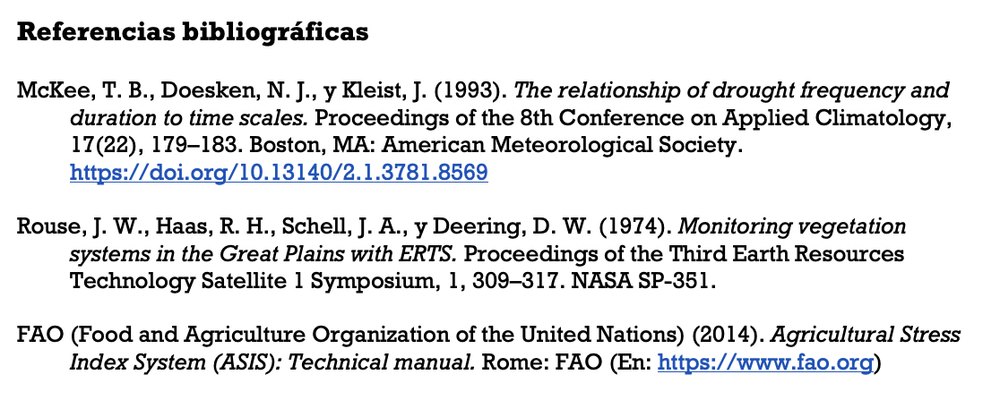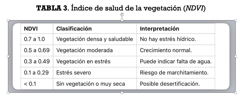 De acuerdo con la tabla anterior, el resultado indica falta de agua al cultivo. Cabe señalar que el NDVI fue diseñado originalmente para estimar la densidad y vigor de la vegetación, pero se ha convertido en una herramienta útil para inferir condiciones de sequía, especialmente en zonas agrícolas o vegetadas.