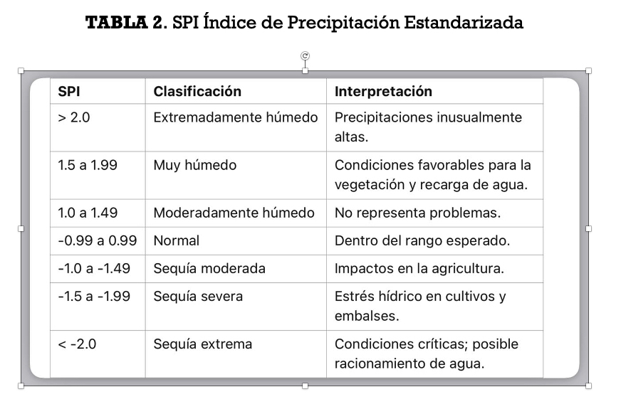 Dado que la sequía puede manifestarse en diferentes dimensiones, también los indicadores varían según el tipo de información que integran y el propósito para el cual se utilizan. Algunos están enfocados en detectar desviaciones climáticas (como el déficit de precipitación), mientras que otros reflejan el estado de la vegetación, del suelo o de los sistemas de almacenamiento hídrico. En la TABLA 1 se resumen los indicadores más representativos, diferenciando su enfoque, las variables en que se basan, su escala temporal típica y observaciones clave para su interpretación o aplicación. Esta comparación permite valorar su utilidad en distintos contextos, incluyendo la posibilidad de incorporar criterios locales.