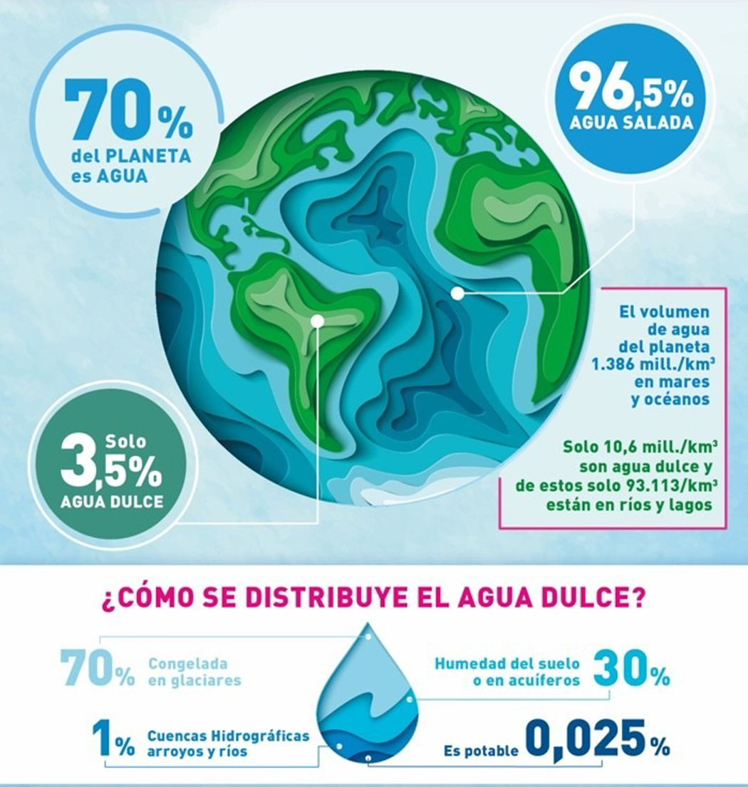 En consecuencia, sólo el 0.6% de toda el agua dulce de la Tierra se localiza en el planeta como agua dulce superficial. (Es decir, sólo 0.252 millones de kilómetros cúbicos).