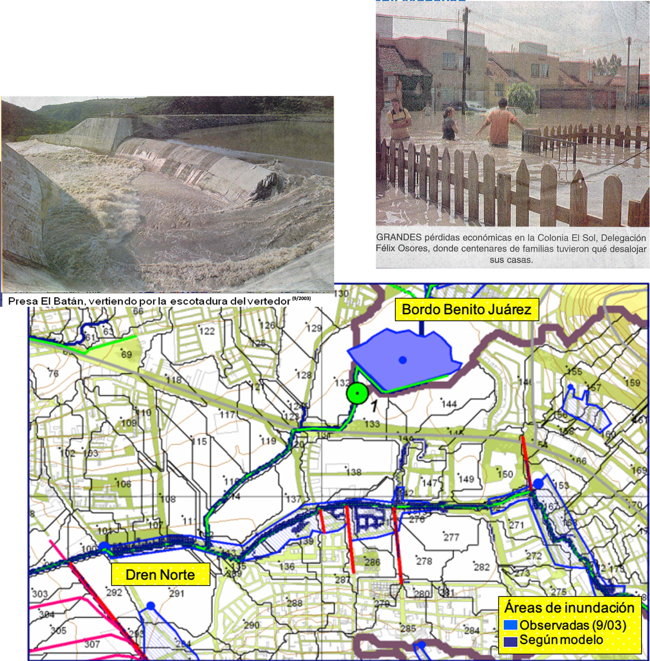Se ha planteado un modelo de tránsito unidimensional de flujo por toda la red de drenaje de una cuenca, basado en una solución integral de las ecuaciones de Saint-Venant (modelo de convección-difusión), y en el cambio que experimentan los coeficientes de celeridad y difusión cuando la escorrentía ocurre en la sección modificada del área (planicie) de inundación. El resultado del modelo corresponde a una aproximación del fenómeno, no sólo por las hipótesis en las que se sustenta la modelación (flujo 1-D, tránsito basado en el modelo de convección-difusión, volúmenes de excedencia estimados como una diferencia entre hidrogramas con y sin efecto de regulación, y distribuidos según la capacidad local de retención de cada superficie tributaria) sino también por la representación fisiográfica aproximada del área urbana (MDE adaptado a escurrimientos) y la distribución que se ha hecho de los datos de precipitación. Sin embargo, ha sido aplicado con éxito en la simulación de eventos extraordinarios, como los ocurridos en la ciudad de Querétaro durante el mes de septiembre del 2003, en tanto que el modelo reprodujo la magnitud de los escurrimientos, así como las características principales de las manchas de inundación registradas. Destaca, por último, el tiempo de respuesta que tiene el modelo para hacer una evaluación casi inmediata acerca de la situación que puede generar un evento de gran magnitud, en especial cuando deben aplicarse medidas oportunas de protección ante tales contingencias.